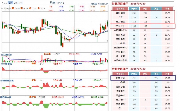 目前持股[均豪5443][堃昶6265][鼎元2426]-----------------------------------[均豪5443]104-7-20 開盤13.95元融券最後回補日: 104/07/20