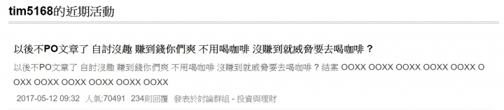 Ziv0828 wrote:會看笑話的就是被T...(恕刪) 只要在本樓說話不禮貌,光會評論別人的留言又提不出任有根據的看法,或是沒有內容的留言光洗盤‧自然是黑名單的座上嘉賓‧其實很多人的要求,只是希望天天有人可以分享高點跟低點,當成跟單參考的對象‧賺錢就是自己英明,找到明燈‧點亮幸福未來的的前途‧萬一錯了難免有怨氣‧所以以前不是常提醒大家,網路很多情況就是有錢賺自己爽,但是萬一錯了,威脅要去舉報讓人喝咖啡‧這就是網路的情況‧所以如何讓人盡展所學?這就是這個網路的實際情況‧大家都想看到必贏的分享留言,萬一有錯‧就拉一堆人‧拼命指責‧但是沒有留下半點有根據的看法‧純粹就是為了指責而指責‧問題這世界上有必贏的分享留言嗎?這個大哥算是很熱心的朋友,但是熱心過頭了‧結果就自我關閉帳號‧不然他對網路的貢獻也不小‧