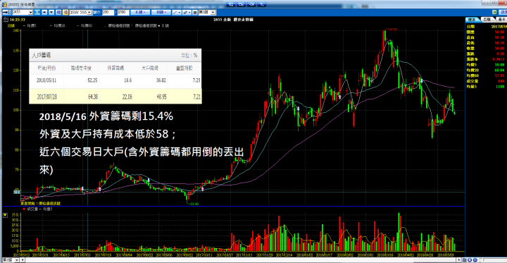 我個人習慣由籌碼、技術、消息等許多層面來分析一檔個股,這裡就先分享二個較容易懂的。首先先貼上外資及法人的籌碼(這是我在5月16日盤後做的),三大法人在去年7月28日起漲前的籌碼集中度有64.38%,到了5月11日僅剩52.25%,然後在前天5月17日(也就是185樓的新聞)發佈後主力刻意在當日拉抬股價倒貨,5月18日時籌碼集中度僅剩49.82%;其中外資倒貨最為邁力,外資由4月30日開始每天倒貨;可以試著去想想,當主力都在倒貨時,是誰接走了?下面這張是5月18日收盤後60k的技術分析,我常用均線、RSI、kd、macd來分析走勢,但這張圖是利用簡單的5MA,20MA,60MA就可輕易規劃出後續走勢。這波全新由高點140往下跌的主因是先前消息傳出VCSEL認證沒過,5月17日的媒體消息放出認證已過,這種天大的好消息應該要在當日漲停慶祝才對啊,但為何利多卻只漲了一天不到,隔天差點打回原點,這不是很瞎嘛。全新目前是空頭走勢,第一個支撐點是4月26日的低點85.6,第二個支撐點是去年11月17日的起漲點75.5,接下來會如何走,讓我們拭目以待吧。