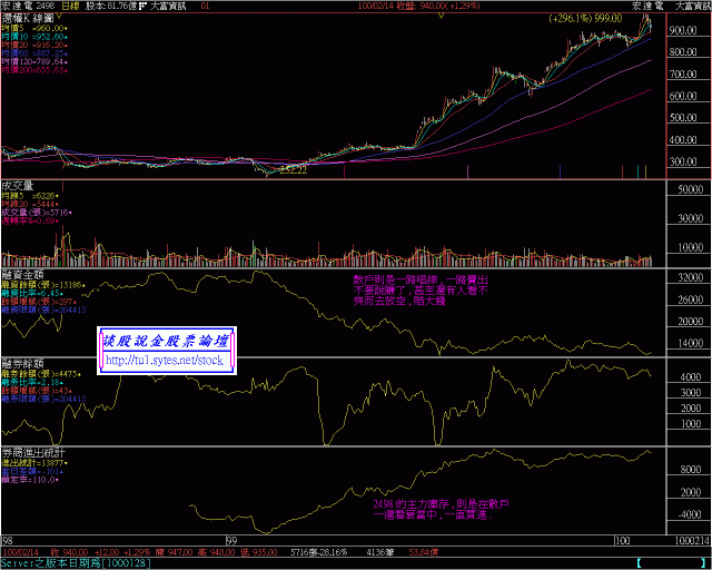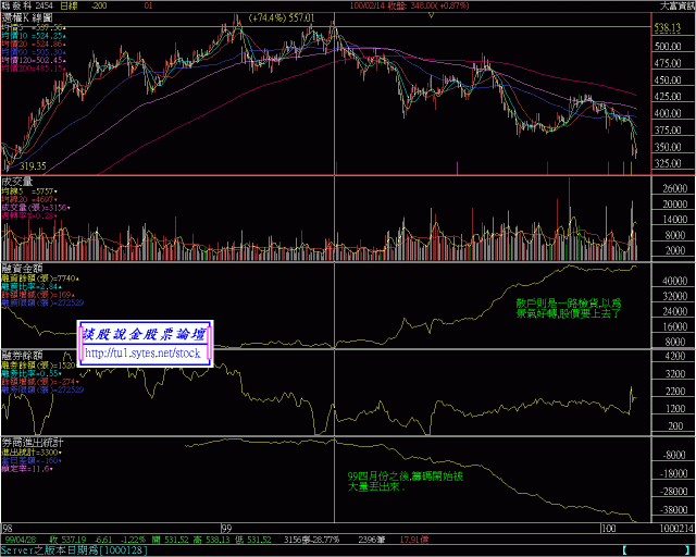 有人提到聯發科 , 我就順便談一下吧 !去年大家不看好 2498 , 而比較看好 2454 ,原因不為他 , 也是因為看好 2454 的產業景氣 , 而看壞 2498 的產業前景(一年後,大家都知道結果了)而從圖型上來看 , 圖中的主力庫存(券商進出統計) , 則是從 99.04 起 ,開始大量丟出來 , 甚至在第四季起 , 開始用力丟出 .但是散戶還懷念著山寨機光榮的過往而不知警覺 , 越跌越買 .股價越低 , 融資越高 ..現在才聽到 , 原來第四季的業績很慘 , 而100年第一季可能業績還會輸小 m真慘 , 股價都已經夭折了 .. 頭都洗了 , 能抽身離開嗎 ?大家不看好的 2498 宏達電 , 主力法人則是沿路買進散戶看不懂產業分析的 , 別再堅持用產業分析來面對股票了