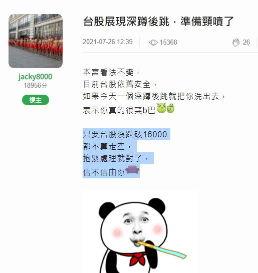 jacky8000 wrote:台股罕見7天噴掉800點,應該噴的差不多了吧?真的不能再噴了喇 7/26你自己說的本宮看法不變,目前台股依舊安全,如果今天一個深蹲後跳就把你洗出去,表示你真的很菜b巴安慰只要台股沒跌破16000都不算走空,抱緊處理就對了,信不信由你沙發