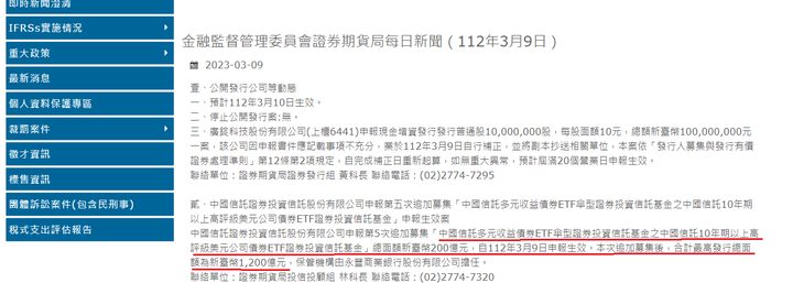 中國信託證券投資信託股份有限公司申報第5次追加募集「中國信託多元收益債券ETF傘型證券投資信託基金之中國信託10年期以上高評級美元公司債券ETF證券投資信託基金」總面額新臺幣200億元,自112年3月9日申報生效。本次追加募集後,合計最高發行總面額為新臺幣1,200億元,保管機構由永豐商業銀行股份有限公司擔任。金融監督管理委員會證券期貨局