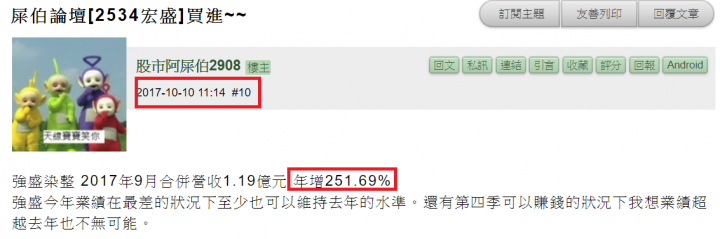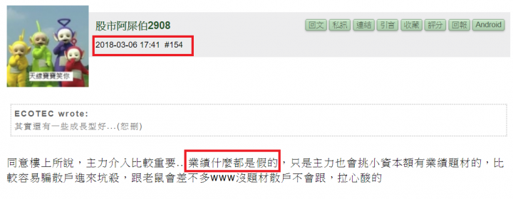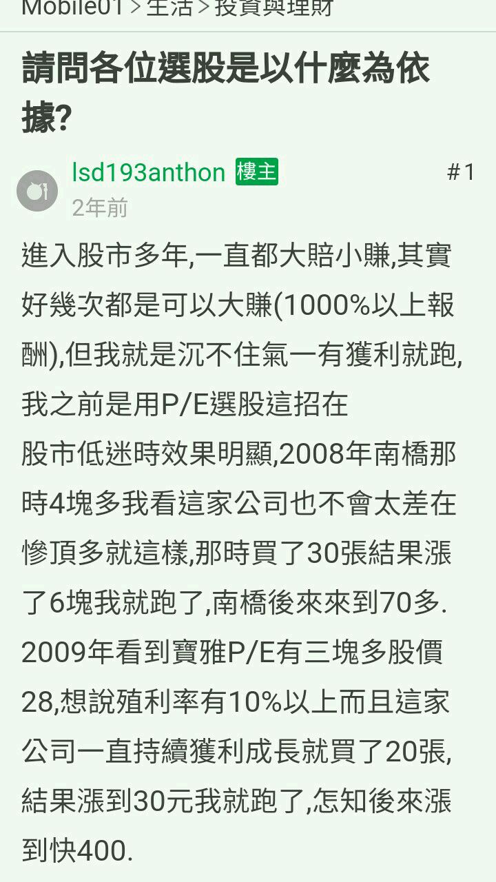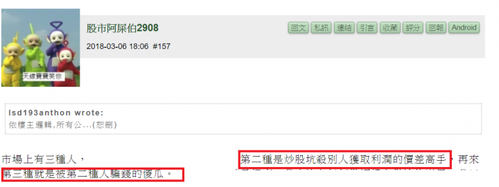 lsd193anthon wrote:屎伯2908小劇場-...(恕刪) 我的原文有寫第一種人是長期拿現金股利的股東,為什麼你幫我把我說的話塗掉了呢???想要刻意抹黑我嗎另外我確實在股市不如你資深,我股齡10年而已,2008金融海嘯那年進入股市的。雖然還有非常非常多要學習的地方,但我股齡可沒你想像中短。另外你一直假想我在跟你戰,其實我並沒有。當你在你的樓用難聽的話罵我或羞辱我的時候,我當然就會反擊囉如果你不戰我,不就沒事了嗎?
