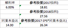 今天比較閒 做了一個不負責任分析 根據以下幾點計算EPS1. 70億元庫存,估計反應在3 4 5 6月共計四個月每月(EPS)0.0425107872. 12吋廠最高五萬片,目前兩萬片,建制新產能預計四月投產每月增2,000~4,000片,以3000片計算貢獻, 貢獻於6月起算(EPS) 0.0043725383. 營業利益率 保守算 8.92%4. NOR Flash(佔營收55%) 季調漲5%~10% (保守以7.5%計算) 對營收之影響,以四月起算 (%) 4.13%5. 8吋廠製程由110奈米推進到75奈米之貢獻,所產出的NOR Flash顆粒數倍增,四月進行轉換,六月產出,8吋廠可能是NOR,以NOR佔營收55%計算,貢獻估增加55%,以45%計算,貢獻於7月起算(%) 145%6. 70E募滿2017年預估EPS 1.88以現金股利六成 1.13 殖利率6% 來計算 參考股價 18.81以同業本益比 14來計算 參考股價 26.34若5/26 前股價漲到 10.75 ,相當於減增資後的 參考股價 18.81若5/26 前股價漲到 15.05 ,相當於減增則後的 參考股價 26.34第三點 第四點 已經計算的很保守,但未計新移入機台的折舊,不管新增的折舊多少,營益率守住8.92%應該不難第六點 私募若未發生 或未募滿,EPS會再高