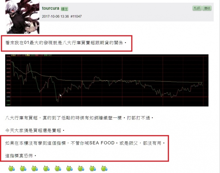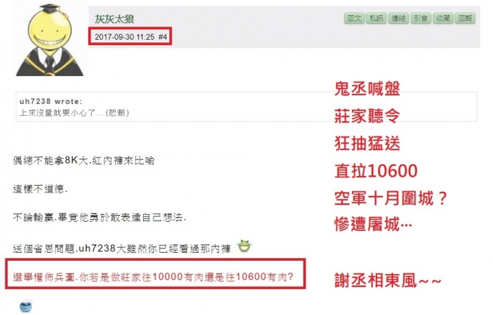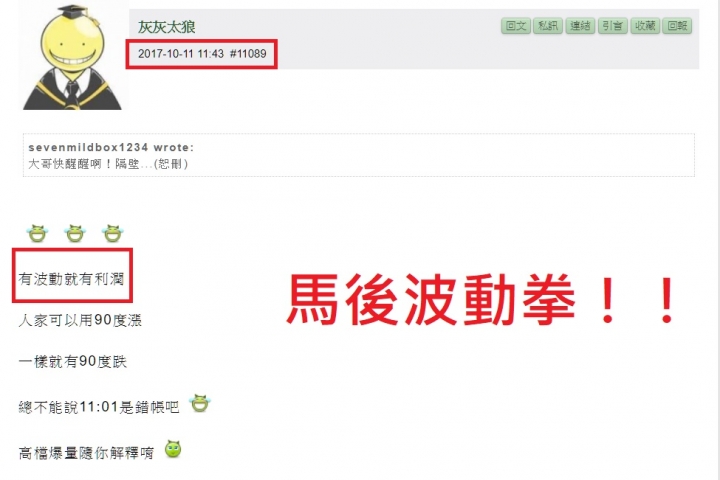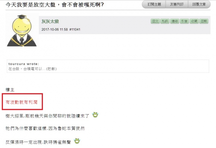 ZacLee wrote:T老闆實在是太認真...(恕刪) 這個殺天殺地亂殺一通"老輸"更絕更利害, 早上價位搭配另一張T闆貼的"似是而非選擇權圖"去操作, 包你輸一榻糊塗, 越是貪心去攤平, 一日破產不無可能發生 ~當然, 事後老闆一定會說這是空氣單,不算!!!破產你家的事!!