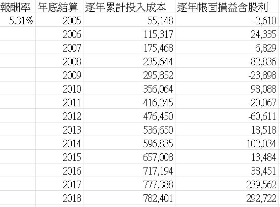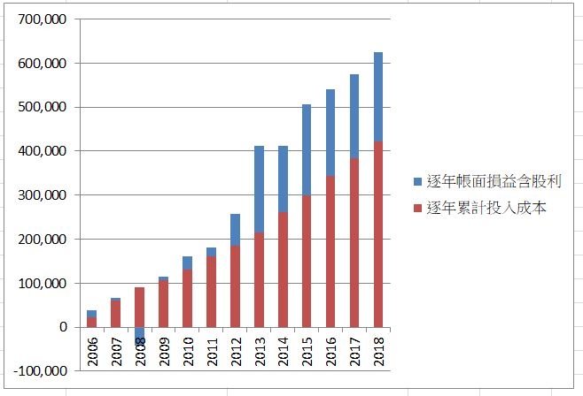*逐年帳面損益計算方法為該年度最後交易日之當日最低價*持有股數+歷年累計領取股利