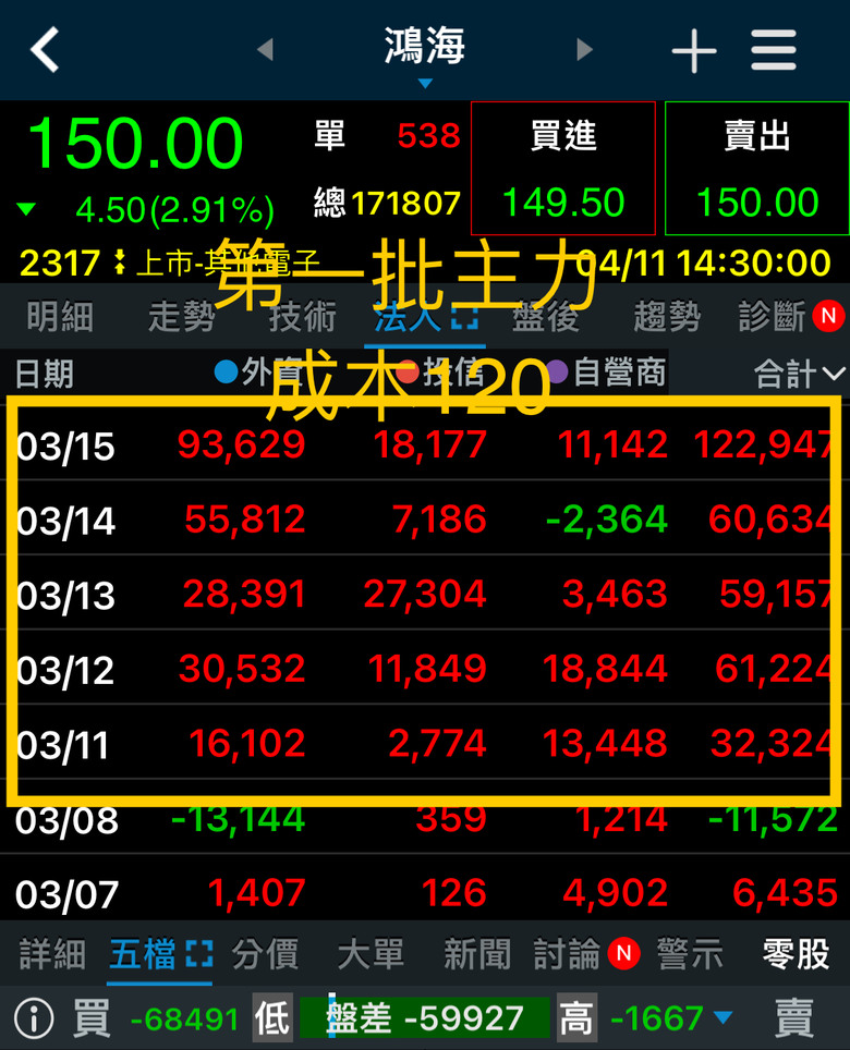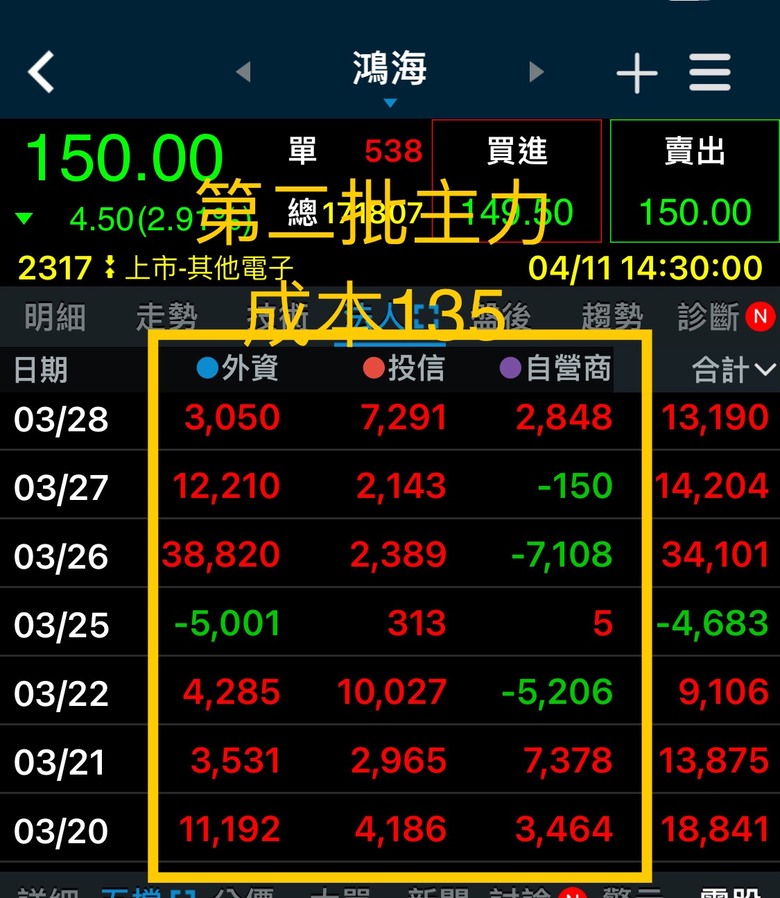 茶太 wrote:某人就開了一堆帳號不...(恕刪) 你分析要符合真實情況,不是每次都亂喊一通…….主力成本135、120,這個拉回135就是要買進,跌到120也是要買進,哪來的100?這裡有50萬張鴻海,除非果凍倒貨,不然哪來的貨到100?