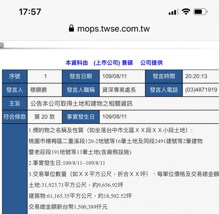 載板大廠景碩(3189)公告,以公開標售的方式,購買華映楊梅廠建物所有權暨座落土地,所購得的土地面積約9656.92坪,建物面積1萬8502.52坪,總計15億元,未來將因應產能擴充計畫及公司營運規劃之用。