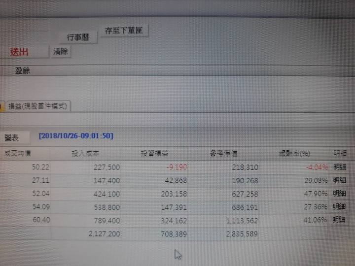money1688 wrote:底部來了嗎...(恕刪) 底部??同學。我還沒回補耶。別嚇我。趨勢不易形成。一但形成很難改變。跌勢在任何一個點。都會引爆開來。圖二。是10月12日。創新高的獲利。看來又準備再創新高了。希望別太久。