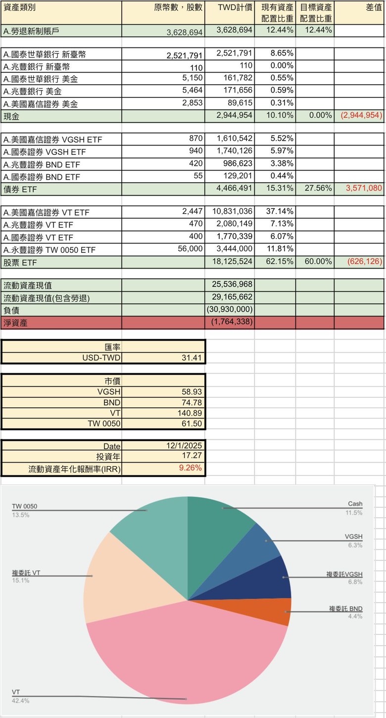 我就是愛拍照 wrote:這幾年從股市,看你的表,賺了有一千七百多。應該有贏一開始工作就All-In 買房的房價漲幅吧? 小贏而已有了負債後的第一件事是買了房貸餘額壽險,避免萬一突然掛了,繼承人短時間內無法繼續繳房貸。接下來就是規劃提前還款策略,以及調整資產配置。目前大致有幾個方向:1. 退休後才把餘額繳清,可以吃一點利息抵稅的好處2. 資產配置現金部位歸零,改放在VGSH,股票部位依然維持60%的配置3. 1/15再平衡時,若當年度有超額報酬,則把超額的報酬拿來進行提前還款,若無超額報酬,就維持原還款的節奏4. 退休後情況允許時,則一次繳清剩餘房貸,但是不塗銷5. 萬一退休時退休金儲備不足,或遇到高通膨、股市大空頭,只能降低生活慾望、賣掉房子搬去消費水平低的地方、或辦理逆向貸款