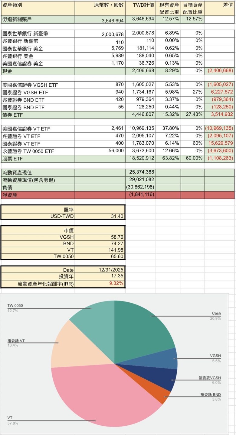 pigstand wrote:今天又有定存到期,提...(恕刪) 時間過得真快,一年一下又過去了2025算是不錯的一年,股票大賺940多萬,台股績效約38.2%至於資產則是從年初的69M大幅增加到82M,但跟之前一樣投資還是很保守,82M的組成是台股多增加到41M,基金和債券是11M,而現金(台幣美金和人民幣)多一點至30M另繼續自提勞退,(含公司提撥的目前總共有3.8M多),明年肯定領完今年大好的員工分紅後要退休了只剩下最後一年需要吃自己老本,待後年滿60歲再把勞退一次領出來補上