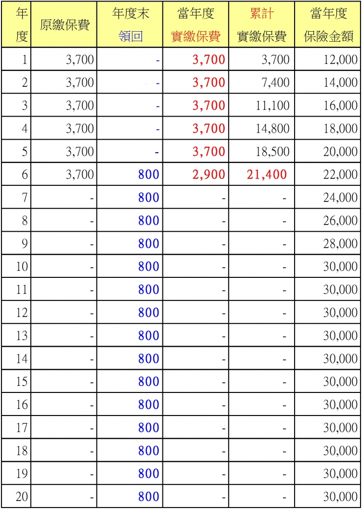 補充一下,這個是儲蓄險,所以當初年繳保費120,099元。今年是第13次繳費,已請保險公司算出,若增加保額到120萬,之後年繳140,741元,並要補足以前年度保費。也就是1~12次繳120,099元/年繳,第12次繳221,002元(若要增加保額到120萬,要補足以前年度的保費),第13~20次繳140,741元。第2、4、6、8、10、12年各領回60,000元(100萬保額的6%),第14、16、18、20年各領回72,000元(120萬保額的6%)。剛剛用Excel算IRR,依照ADM大大的方法,算出來IRR=4.91048%不知道算的對不對?