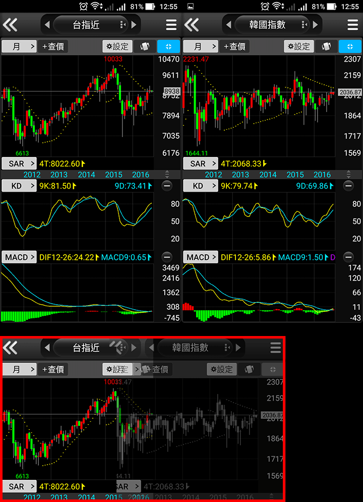 左邊台灣,右邊韓國總經什麼的不是很懂以純技術面來看,盤態並不好先前走長多的推測要改成保守看待不排除可能會走韓國路線打了五重底還是破,但不殺,又重打底,反反覆覆 ...MACD翻紅又翻黑,翻了五年還再翻就是個停滯狀況,經濟不差,但也不算好的氛圍所以該漲不漲也要跌不跌的台灣目前位階相當於韓國2014年8月那邊