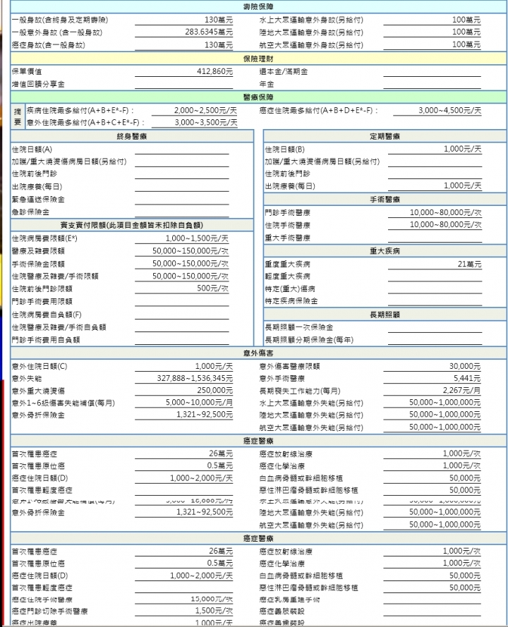 Tiger3163 wrote:小弟也是2007年...(恕刪) 您好,這張是保障匯總表,也就是說您可能買了好幾張保單,這個表呈現的是綜合的保障一覽但是這樣看不出個別保單個詳細資料,包含是否是終身 還定期險等等其中可以看的到住院日額,實支實付是有的,意外保障等等的保障大抵上都有,但....的確如您所說,額度都蠻低的,保障都有點薄弱供您參考囉