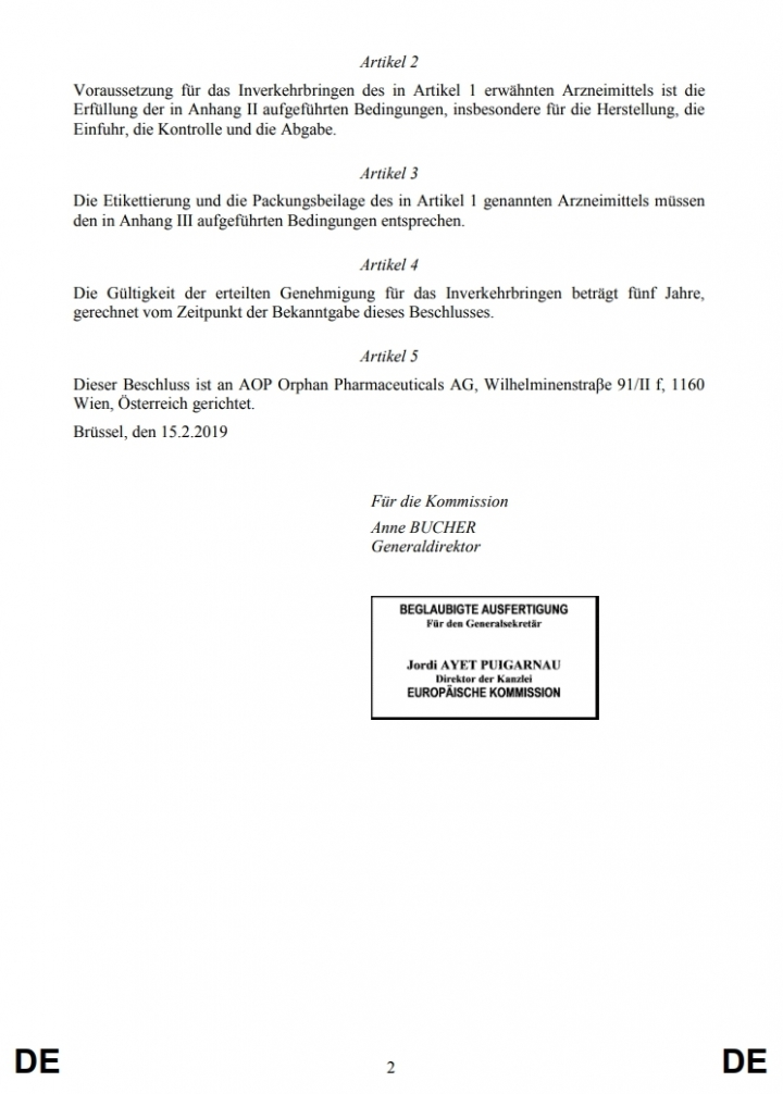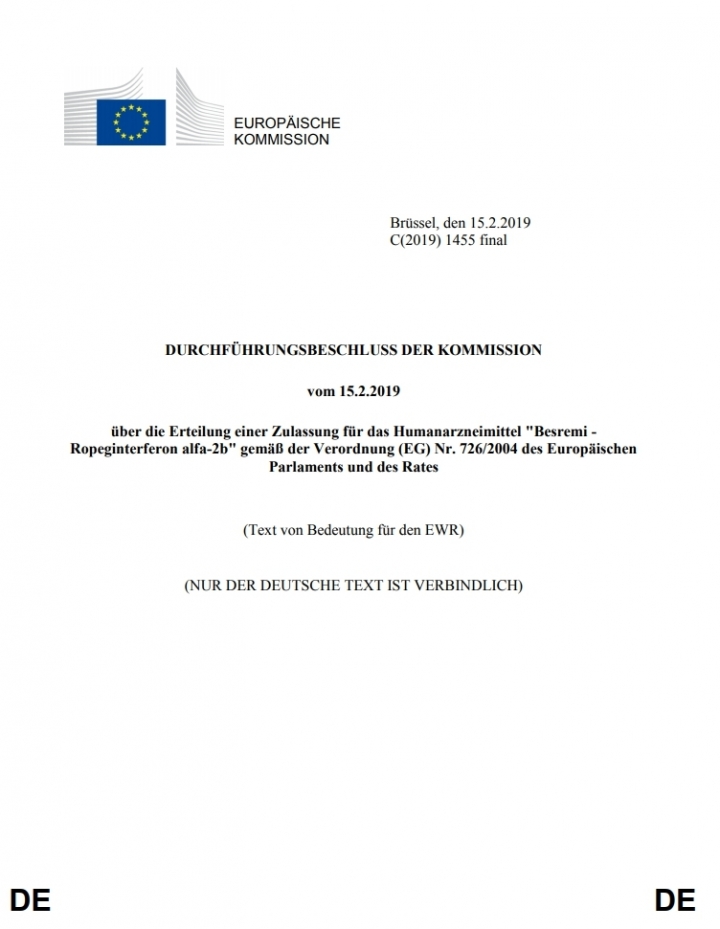本公司授權歐洲AOP公司之新藥Besremi -Ropeginterferon alfa-2b(商品名稱為Besremi)於108年2月19日EC (European Commission)網站公告獲得歐盟EMA新藥上市許可 (marketing authorization application, MAA)。