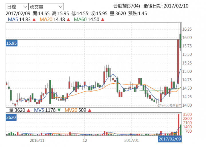 清談無益~!實戰有證據!版主的[宏達電的籌碼分析]可以當成練習標的!-------------------再舉一例,漲上月線的股票[合勤控3704]106-2-9 漲停15.95元股本44.12億每股淨值: 19.72元融資餘額7148張,在低檔!-------------------符合版主的設定條件股價若創20日新高,之後是否會再續漲?1. 股價>10元:為了排除一些價超低的全額交割股。2. 創新高那日成交量大於1000張:為了排除量太少容易被操弄的標的。3. 股本小於100億:因為是找飆股,所以排除一些股價較牛皮的大型股。-------------------我逢低買進,再追蹤!