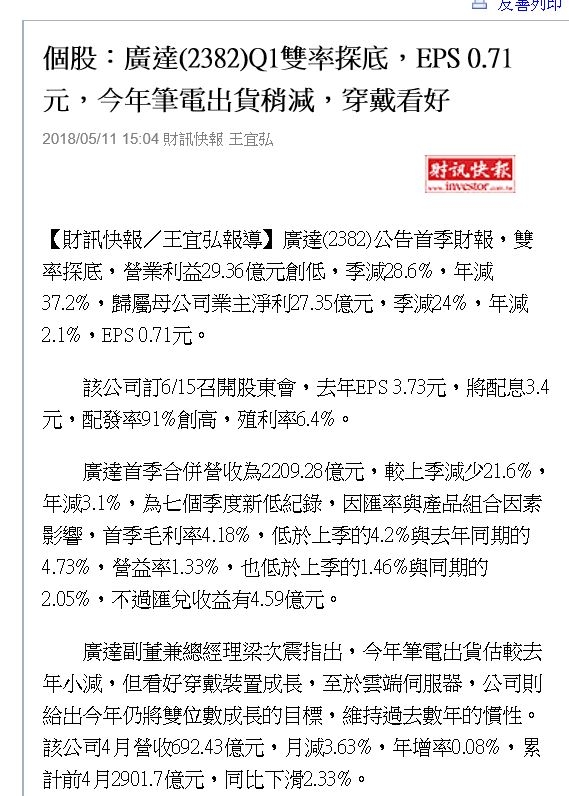 其實各種產業都是輪流換班,物極必反,只是沒有人抓到那個極,只要抓到相對點就可以,我現在是不玩三大法人的股票,分分股利比較多,當然如果他們一進來漲個25%,那就是我跑掉的時刻,不過因為跑得快,我及我爸的禾伸堂只賺25%,我以前的千如也只賺30-50%,沒辨法加偣致富,但至少保主力,誰知道明天會發生什麼事,特別是川普時代,我更保守等待黎明.然後就基本面為主加強比較多,因為主業是工作不可能每天看.不過電子產業上中下有幾個關鍵角色的三大法人變化一定要知道,才知道發生什麼大事,早期玩股票資訊沒那麼多,複雜度底,所以定存股領息,可是資訊越後來越公開複雜度越高,但變中有常,常中亦帶變,所以抓住常-規則,至於財富來得快,去的也快像我老爸,一損失上百張,一賺賺很大,多大+基層工作可以養四小孩還有四間舊房子及養故鄉的長輩,財富來得慢,去的也慢,像我,選標的也是如此,慢比較好即時反應,快則很難反應,除非是無業游民.20180512 紅海就把它想成種花店,所以你是定存股沒有差,它有很多隻金雞,但要炒股就不一定,以前這一招種花店玩過及ADR,其實沒什麼差,郭董老了就是要接班部局,像57所說強幹弱枝像宋朝那樣,才不會他一離開就像元朝那樣倒了,畢竟他的接班人沒他那麼強,郭董也老了,接班人只要持股收利息就好,可以吃幾代,決策還是各地諸候,種了種花店11張每年一張,結論如果早期投入成本越低,股價沒差,晚期投入則只是穩定的定存股.一切都是商人的數字遊戲,皆有他們的目的及算盤,我目前儘量避開這種標的物,因為定存股有種花店就夠.紅海破百更不用講,我還是找個25-60成長性的標的投資比較好紅海是佈局全球的公司,聽說郭董講過沒有200,他不會退休,換句話說未來至少還要一次減資,會打敗TSMC然後他就可以把棒子交給兒子,然後他的子孫光領股利可以領很多代,光子公司就有八百多間諸候幫郭家打天下,那你要多存幾張,對我們而言未來只會越來越貴,太遙遠~另外,雖然是紅海,可是哪一天不會成為中國或美國或台灣或日本....其它國家的眼中盯,他現在都可多方逢源.台灣政客前陣子要打他麻煩,在美國他還請日本人去跟川普講話,在中國與習大大再連結,在南美及墨西哥請自行去看雜誌,其實有時沒你們想像順利要水要電要土地.這告訴我們他很清楚,政治是他的隱憂,所以他是全球佈局,地域狀況不對就撤資,你知他在捷克有一楝莊園豪宅,好像是二億,大到一個科園區大光請人整理每年要數千萬,這是導遊指給我們在捷克看說的然後在高雄軟體園區本來要進駐後來不要,因為花媽沒鳥他,他也不爽就沒再投錢,很多國家更不用說,他是全球的成吉思汗,所以才需要飛機飛來飛來去.....所以把紅海當定存股存也不錯,八百多間諸候幫郭家打天下,你們的子孫也可以定期領股利,不錯~那只是商人的數字遊戲,反正他也沒有虧待你們,減資股價相對也會飊高,只是出現零股不好脫手,就我們一樣在台灣種花,你們在天下種海一樣,你們的風險比我們根留台灣還低~哪一天被統一,你們的紅海還在,我們的種花店不清楚,阿共要不要承認?理論上是會啦~所以你們定存紅海,就是佈局全球,有專業的經理人才幫你們,有什麼不好,紅海每個人都可以進去工作,但沒有幾個人可以做二年以上,那真的是血汗,TSMC我還敢但紅海真的很累.不要動不動想炒股,錢來得容易去的容易,錢來得不易去的也不易其實紅海也是走子公司貢獻母公司模式,如下中華車本業不好,但業外靠大陸轉投資養台灣中華車就夠了,不然台灣車市是能怎麼樣,所以紅海減資就不要太認真,反止錢還是到手中,股票減少但股價一樣飊高,11年來種花店也是如此,會大漲也是減資不然怎麼可能從60->110,那就減資+股本變小+籌碼集中的威力,定存股沒什麼不好,但要注意董監持股,我不喜歡外資且董監持股至少三成,因為之前的經驗.另外投資組合內一定要分散至少五種,最好不同類,有時A時可賣A,B時可以賣B,C時可以賣C,但都要在相對低點切入,那產業輪動才能賣股,一年內其實都有所謂的產業輪動,像現在是原物料可以準備賣的時候,因為油價上漲開始上升,鋼鐵業也可以準備賣,...可是若電子業開始出現相對低點時,反而要找機會切入,何時低點就是要自己去找,我的凌通那時11月中入場,其實最好的低點在8-9月,就是Q3還未出來,陰陽不明,可是建議還是跟著水流走,Q3新聞好一出現就切入,元月時就可以灌籃.我的艾訊也是Q1新聞一出就立即切入才能相對低價承接,之前就鎖定,那成本最低.evantop wrote:最近財報一支支出來...(恕刪)