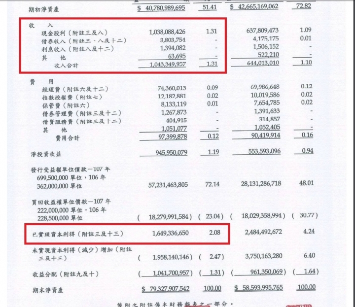 p大,你要的這種資料有,但是不容易找,重點是數字每周都在變化,你難以得知基準日當天,基金所得種類為何?(這個報告書元大已經懶得公告在ETF官網)公開資訊觀測站→基金財務報告書→輸入元大代號 A00005、年度 ,找元大卓越50pigstand wrote:說到這個我對元大就...(恕刪)