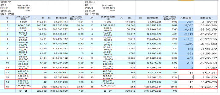 這周超級大戶增加0人,股票增加17058,400~600張的增加8人,股票增加3925張,5~400張的少了1136人,股票被吃了20940張,0~5張的人數多了827人,人數雖然增加但股票還是被吃掉382張,2017年的最後一周,大戶持續吃掉股票,籌碼持續向大戶集中~~