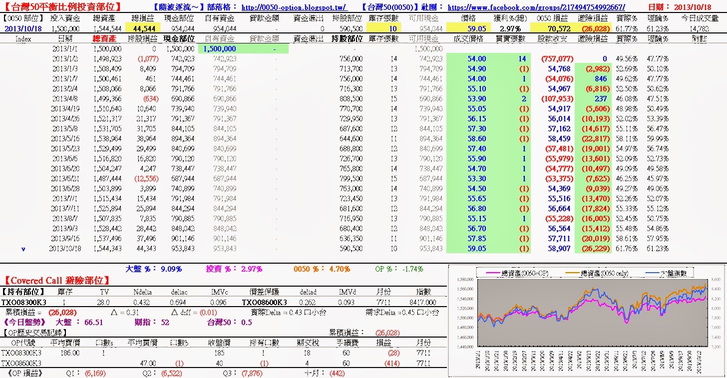 今日(10/18)盤中,以59.05元賣出1張台灣50,避險部位△=0.31,請參考:損益狀況台灣50平衡比例投資部位:+70,572Covered Call 避險部位:-26,028詳細請參考:http://0050-option.blogspot.tw/2013/10/0050-covered-call-20131018.html順便分享程式下單的交易畫面:http://youtu.be/OFEfR9Ns6eE(上次的連結檔有誤,請參考此篇。)歡迎加入台灣50(0050)平衡比例投資法:【社團@Facebook】、【論壇@Google】。