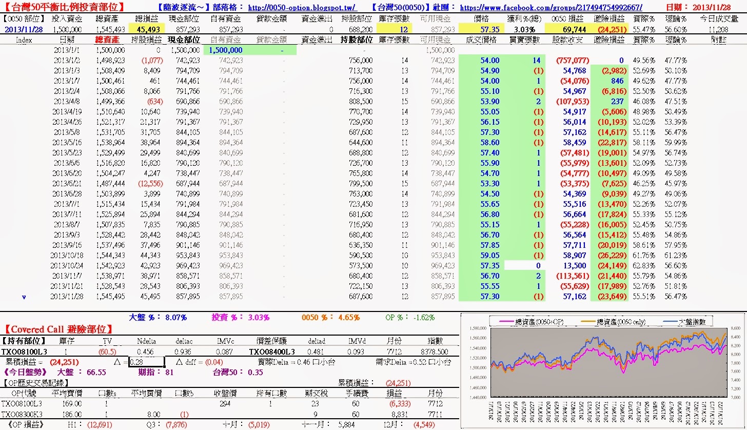 今日(11/21)盤中,以55.55元買進1張台灣50(上次交易11/21以55.55元買進1張),避險部位△=0.28,請參考:損益狀況台灣50平衡比例投資部位:+69,744Covered Call 避險部位:-24,251詳細請參考:http://0050-option.blogspot.tw/2013/11/0050-covered-call-20131128.html歡迎加入台灣50(0050)平衡比例投資法:【社團@Facebook】、【論壇@Google】。
