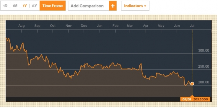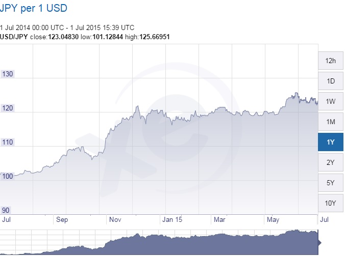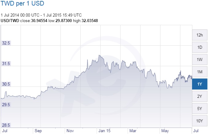 回歸正題談2049上銀, 目前媒體還有股東會好像都沒什麼事一樣. 那看看他的競爭對手吧, 號稱頭號競爭對手日本的THK, 因為日圓貶到125, 基本上上銀的單都轉去他那了.以下是THK一年來的走勢:從去年八月的2300, 漲了快四成到三月高點3290, 之後跌了快兩成到現在的2612.而對照日幣的走勢日幣從去年八月的100, 扁值到11月後, 幾乎是保持在120, 直到五月中又貶到125, 直到最近的122.再來看看上銀幾乎跟THK是相反的走向, 從去年的七八月的高點378, 跌到最近的200左右. 跌了快5成.再來看看台幣近一年的走勢去年七八月到一月從29.9到32, 之後都是在30.5~32的區間. 貶值不到一成小的不才, 日幣的貶值效應似乎真的是有, 但是三月之後THK跟上銀的走勢卻是一至的, 這是不是代表上銀最近的一波跌勢其實是因為景氣不好??? 因為連有日幣貶值優勢的THK也從三月的高點跌到現在快兩成.