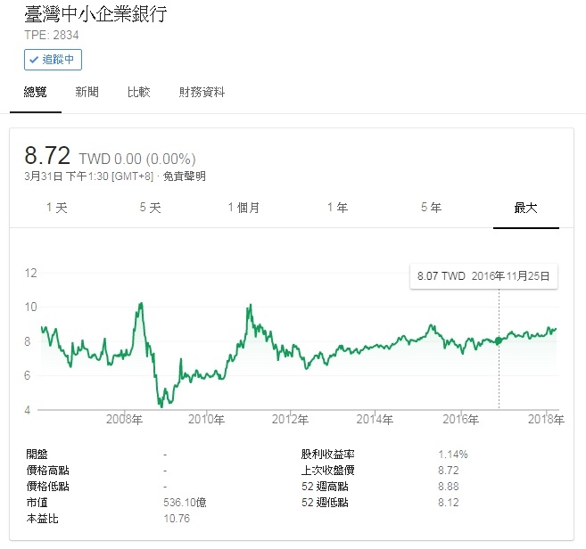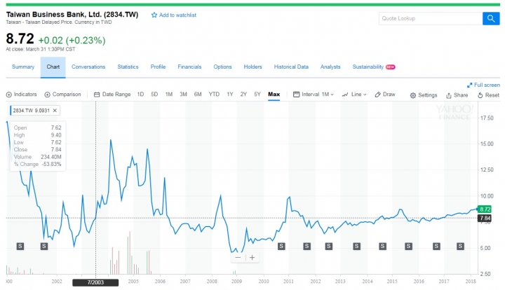 yioulin wrote:樓上 我覺得應該是你自己搞錯了喔~ 李則能 wrote:2008 沒錯大都是雞蛋水餃但自己po的月線圖很清楚,這8年大都8元以上,8元以下大都是下影線😳,當月很快回到8以上8.0看成8.5嗎? 對不起各位,是我搞錯了... 因為用9元以上買了一些,經過歐債危機到現在這麼多年了都還沒恢復,想說貼文提醒一下... 昨天晚上不知是頭昏還是怎麼了,想查一下2008年的價格。因為Yahoo奇摩只有6年多的資料,而美國Yahoo和Google通常有更早的資料,就用它們查了一下。結果Taiwan Business Bank, Ltd. (2834.TW)臺灣中小企業銀行 TPE: 2834顯然兩個線圖都是錯的(?)但是神奇的是最新的收盤價是對的...我還沒搞清楚發生了甚麼事...看來這些資料不能完全相信 2018/4/6 更新:這幾天我仔細看了一下,發現了線圖錯誤的原因。從美國Yahoo與Google查到的資料應該是美元計價,價格是用當時的台幣美元匯率將台企銀的台幣股價換成美元。可是台幣匯率有波動。現在去查詢歷史股價,要求以台幣顯示時,歷史股價以現在的台幣匯率換算,因而造成線圖的錯誤。