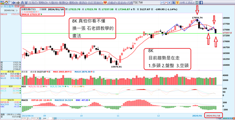 jacky8000 wrote:以為民進黨當選的唯一好處是,台股應該會衝18000結果昨天才漲一天就挫賽先抓站穩17000別忘了還有封關行情 先別管誰當選應該會怎樣子走寶傑 你怎麼看法寶傑:不用猜 不用想 看圖說故事目前大盤趨勢1.多頭2.盤整3.空頭順勢而為贏面比較大三選一8K 哥怕你看不懂又胡說八道(轉折已先幫你畫好了)~~~~~~~~~~~~~~~~~~~~~~~~~~~可別說技術分析是馬後炮它已經告訴你了目前趨勢走向