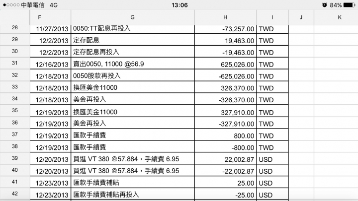 ryanwu924 wrote:P大剛開始做配置的時...(恕刪) 我當初計畫在兩年之內配置70%的股票ETF(0050),每季進場配置一次。第一季建立了8.75%,第二季總共建立了17.5%,以此類推。要注意的是因為股票漲跌以及工作儲蓄的影響,因此總資產的數值以及0050佔總資產比重是浮動的,也造成每一季進場的金額不同。建立完70%的0050ETF之後,我每年進行一次再平衡的動作。並且在2010以及2013,開始將VT納入70%股票ETF的配置裡面。