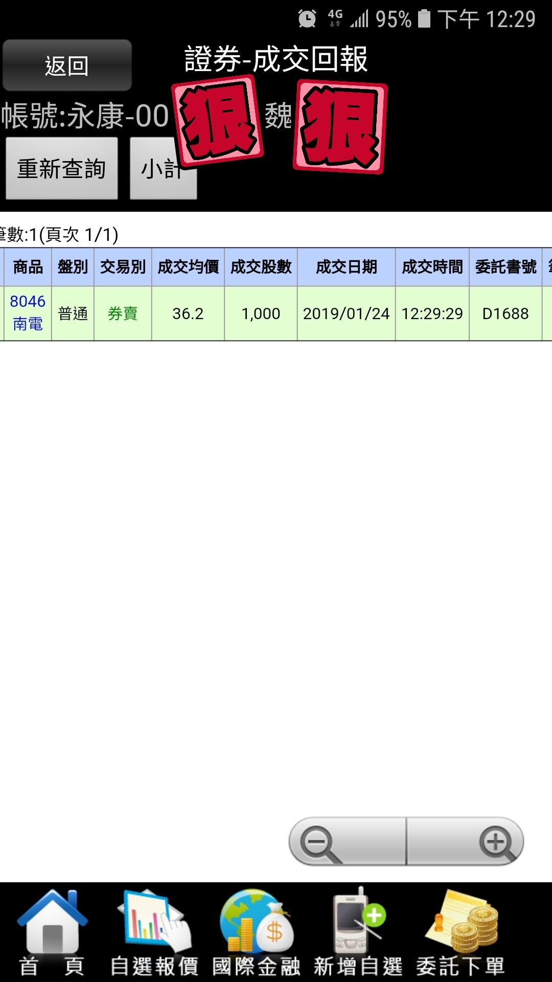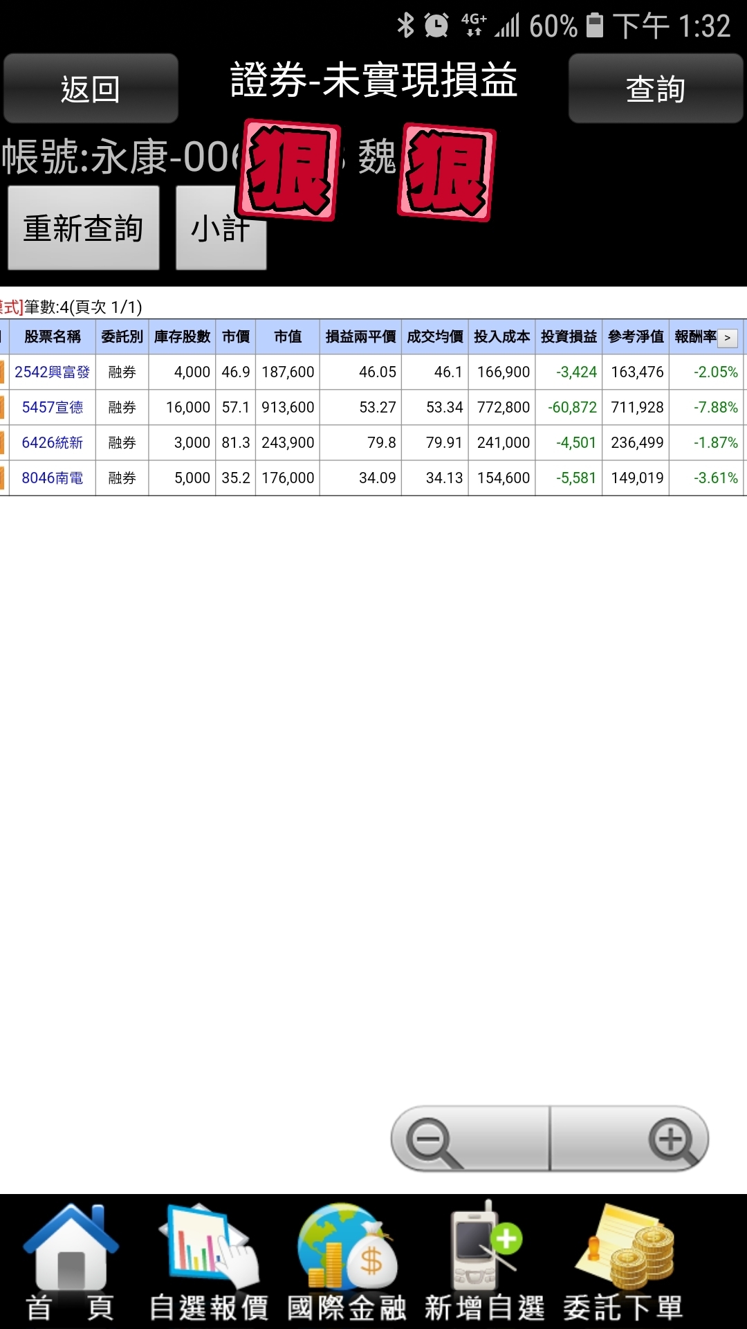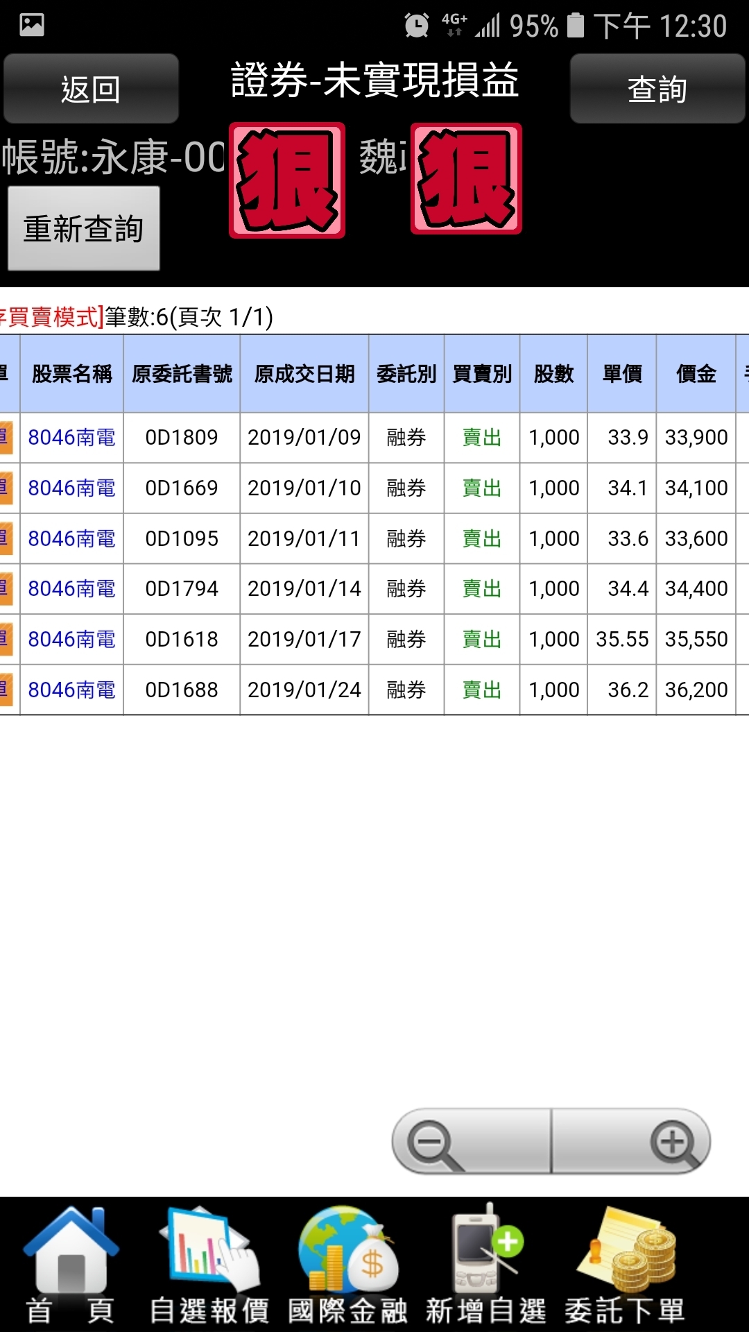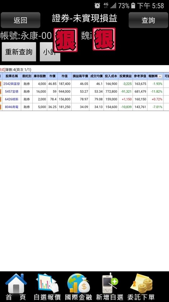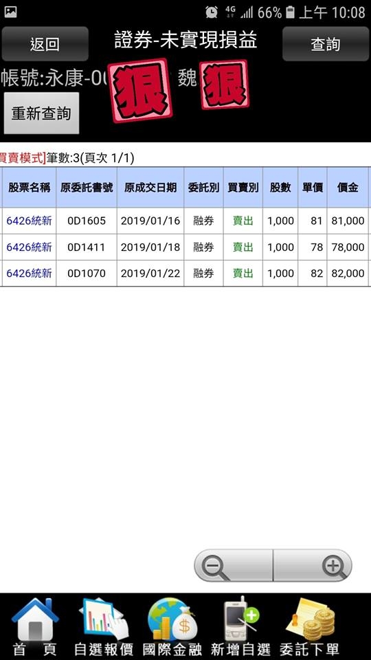 vincent3520 wrote:大大您好,您空過的...(恕刪) vincent3520大。晚安。力山。讓我掏心掏肺卻不能掏老二。主力黑手真頑強。券商沒券跟他玩。我的券商。去年10月底。就停券了。過年後。慢慢開始。有十張券出來。所以我就放棄了。還好只小空五隻。小賠出場。感覺還是找別隻比較好。