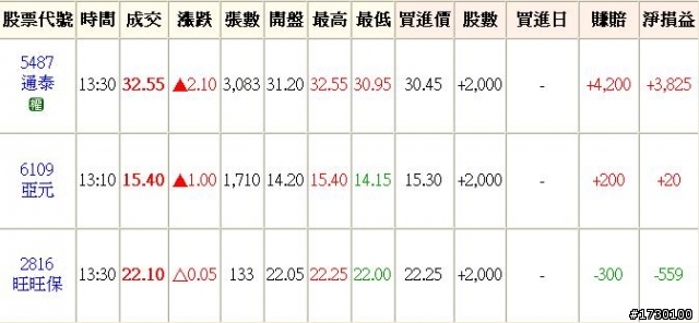 [通泰5487]103-6-25 收盤漲停32.55元主力[群益金鼎-台中]買進量變少!隔日沖[永豐金-員林][光和虎尾]出現!不知道明天是否會開高走低呢?------------------------[旺旺保2816]103-6-25成交量133張,股價22.1元!是否就是[量縮價不跌]的黃金散兵坑呢?