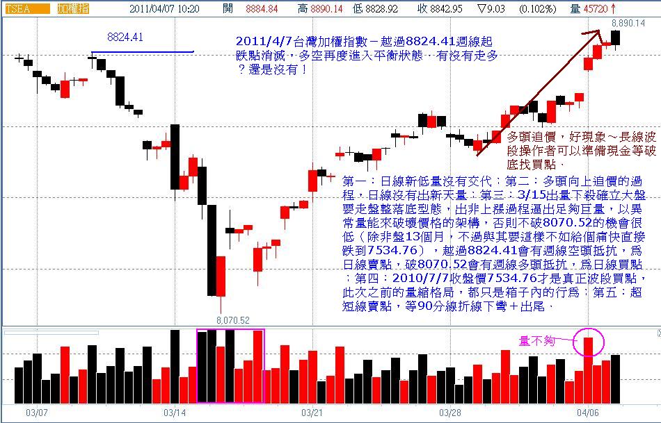 技術面上還要破底(8070.52)的理由,第一:日線新低量沒有交代;第二:多頭向上追價的過程,日線沒有出新天量(8070.52上漲以來,只是擴底過程);第三:3/15出量下殺確立大盤要走盤整落底型態,除非上漲過程逼出足夠巨量(目前沒有),以異常量能來破壞價格的架構,否則不破8070.52的機會很低(除非盤13個月,不過與其要這樣不如給個痛快直接跌到7534.76);第四:越過8824.41會有週線空頭抵抗,為日線賣點,破8070.52會有週線多頭抵抗,為日線買點;第五:2010/7/7收盤價7534.76才是真正波段買點,此次之前的量縮格局,都只是箱子內的行為;第六:超短線賣點,等90分線折線下彎+出尾.