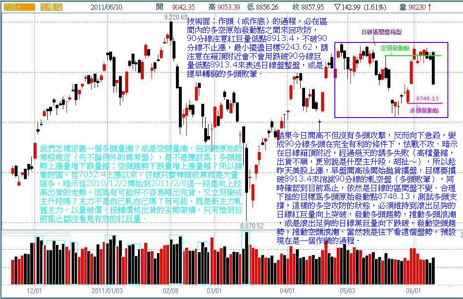 技術面:作頭(或作底)的過程,必在區間內的多空原始發動點之間來回攻防,90分線注意紅巨量低點8913.4,不破90分線不止漲,最小擺盪目標9243.62,請注意在箱頂附近會不會用跌破90分線巨量低點8913.4來表述日線盤整盤,或是提早轉弱的多頭敗筆.結果今日開高不但沒有多頭攻擊,反而向下急殺,變成90分線多頭在完全有利的條件下,怯戰不攻.暗示在日線箱頂附近,經過幾天的誘多失敗(高檔量縮,出貨不順,更別說是什麼主升段,胡扯~),所以趁昨天美股上漲,早盤開高後開始拋貨摜盤,目標要摜破8913.4來消滅90分線的軋空盤(多頭敗筆),同時確認到目前為止,依然是日線的區間盤不變.合理下挫的目標為多頭原始發動點8748.13,測試多頭支撐,這樣的多空攻防的狀態,必須維持到滾出足夠的日線紅巨量向上突破,發動多頭趨勢,推動多頭浪潮,或是滾出足夠的日線黑巨量向下跌破,發動空頭趨勢,推動空頭浪潮.當然我是往下看這個盤勢,預設現在是一個作頭的過程.