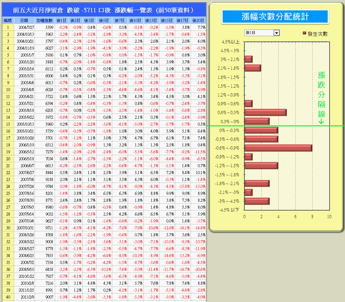歷史上台指前5大交易人近月淨空單口數跌破-5711口(負為空)時,
