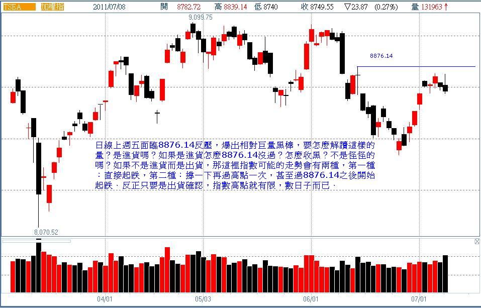 2011/7/5解盤中我已經提到目前箱體的頂底,理論上已經確認出來,箱頂在9099.75,箱底在8433.46,這個區間不小有666.29點,所以按照箱型的三分法來看相對強弱,一個區間是222點,箱型最大反壓(上方三分之一)的地方也正好在8877.65,有沒有與關鍵點8876.14非常接近,所以主力在做箱底也不是亂作的,誤差很小.目前週線收盤價在8749.55,落在上三分之一8877.65與下三分之一8655.55的中間,暗示未脫箱型盤整架構,有效突破8877.65則向上軋空,有效向下跌破8655.55則繼續殺多.關鍵點8876.14沒過,週線還是殺多盤態;就算8876.14越過也只是不殺多,指數在這裡要確立多頭趨勢,困難度很高而且還有好多條件要達成,真的只能慢慢等.