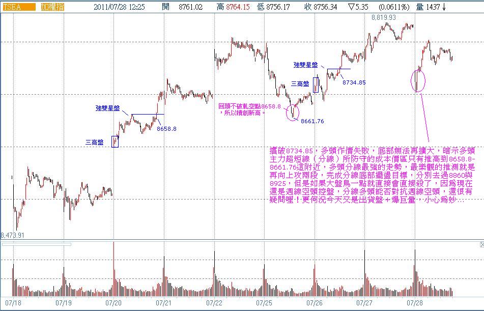今天摜破8734.85,多頭作價失敗,底部無法再擴大,暗示多頭主力超短線(分線)所防守的成本價區只有推高到8658.8-8661.76這附近,所以多頭分線最強的走勢,最樂觀的推測就是再向上攻兩段,完成分線底部擺盪目標,分別去過8860與8925,但是如果大盤鳥一點就會直接殺了,因為現在還是週線空頭控盤,分線多頭能否對抗週線空頭,還很有疑問哩!更何況今天又是出貨盤+爆巨量,小心為妙...