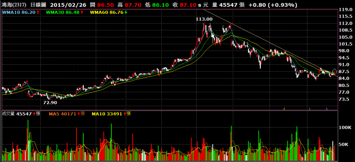 2317是突破下降趨勢的pivotal,現在外資看衰紅海叫好和碩,但股價已經打出兩個多月底部,且本益比不高的情況下,可以視為買點