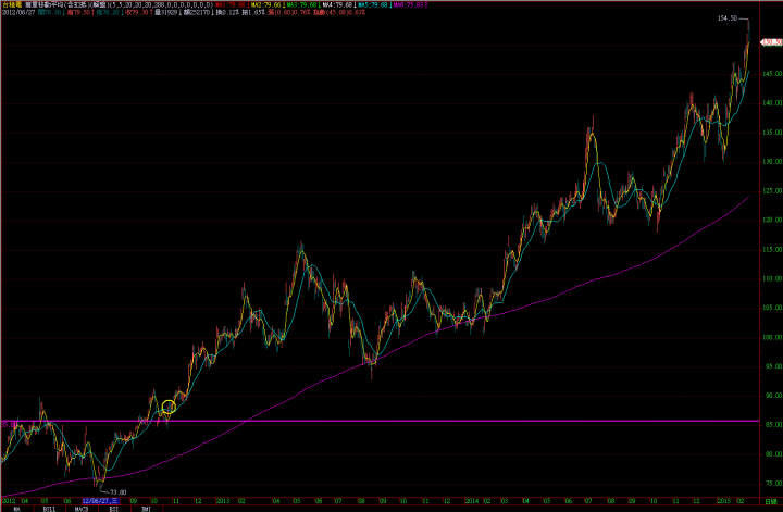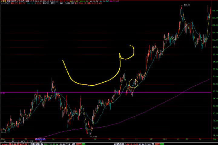 這張圖就是大家期待的反彈股……但時間可能很長……有時候會兩三年才飆一次,資金要夠厚。(就像鴻海那樣……都在下降趨勢了,趴在95以上的大有人在。)
