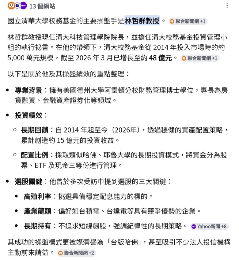 在台灣高教界普遍深陷少子化與預算緊縮的寒冬時,國立清華大學卻靠著一套「校園版哈佛」的操盤邏輯,交出了一份令法人圈肅然起敬的成績單。清大校務基金(永續基金)自2014年進場以來,寫下連續11年維持正報酬、資產規模從最初的5,000萬元滾動至現今約48億元的紀錄。這套年化報酬率達7%的穩健系統,不僅為校方累積創造超過15億元的收益,更因績效太漂亮,吸引大量專業投信機構登門請益。
