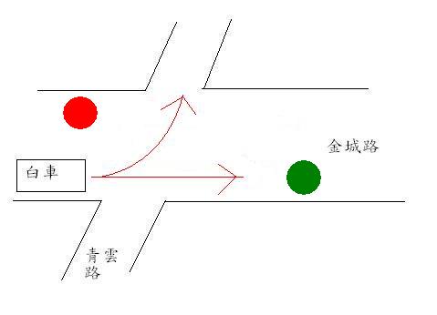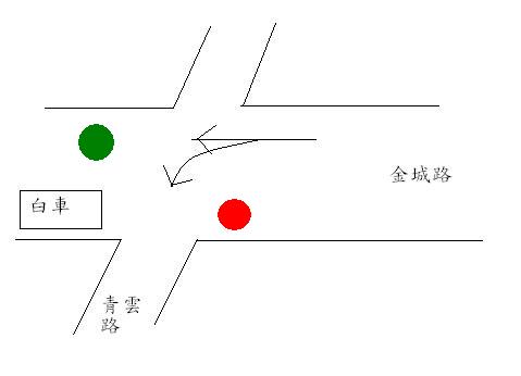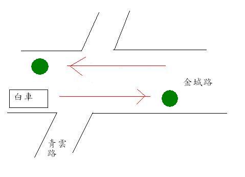 這是在金城路青雲路口,法院前 應該是左轉車闖紅燈因為我記得一開始是白色車對向先綠燈包括左轉燈(如圖一)約15秒後左轉燈消失,兩邊同時綠燈(如圖二)約40秒後 白色車那邊車道會多左轉燈跟綠燈15秒,而對向道則是紅燈(如圖三)