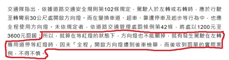 交通隊特別提醒,其他縣市曾發生車輛於左轉專用道停等紅燈時,因未「全程」開啟方向燈遭到後車檢舉,而收到罰單。依據道路交通安全規則第102條規定,駕駛人於左轉或右轉時,應於行駛至轉彎前30公尺處開啟方向燈。而在變換車道、超車、靠邊停車及起步等行為中,也應全程使用方向燈,就算在等紅燈的狀態下,方向燈也不能關掉;違者依42條將處以1200元至3600元,不得不慎。(中央社)