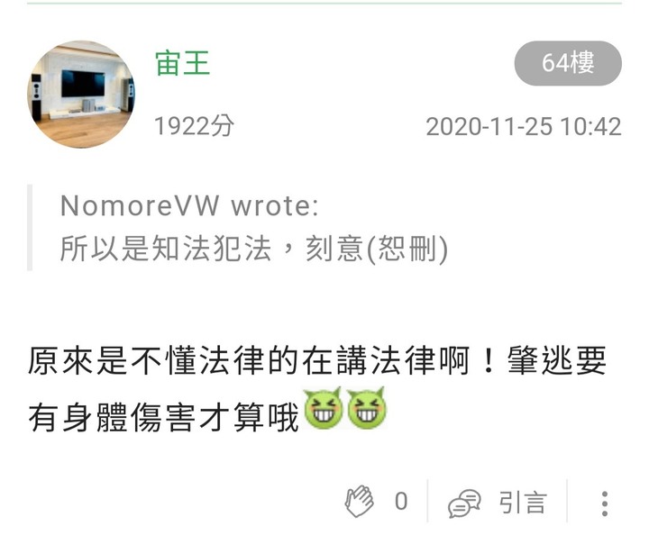 kazamisa wrote:你還有沒有其他梗可以(恕刪) 你來了啊!我很認同你的觀點喔!為了不轉嫁風險給警方,所以我線上檢舉,警方也不用面對違規仔你說對吧!可是你盟友那個王卻希望違停打電話,把風險轉嫁警方欸,剛好跟你po的Errrrr.........?