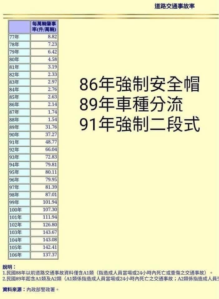 althewind wrote:每次看到有人說待轉好(恕刪) 再說一次數字不會說話說話的是人你的圖表很清楚的標明民國89年開始強制分流然後每萬輛肇事率88年1.5489年31.76哇!好可怕喔20倍耶!但是因為很重要所以我是不是應該把這張圖上傳三次呢?事實上我覺得應該暴增100倍的因為車種分流真的是太可怕了太可怕的謊言前一年只統計死人+重傷的車禍後一年加入受傷(可能只是破皮)的車禍居然只增加20倍我不信我真的不信