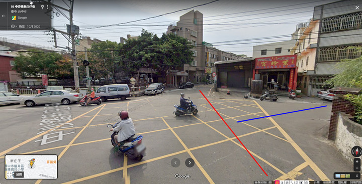 看了地圖與街景,雙方行駛的路名都是中沙路新庄仔巷,無劃設行車分向線或分向限制線,同為單一車道路型,若較北邊的中沙路新庄仔巷與南邊的新庄街二段是原同條路、較南邊的中沙路新庄仔巷與東邊的新興路是原同條路的話,雙方就都是直行車,車道數相同,同為直行車,左方車應禮讓右方車。主要還是要看當地交通局怎麼判定這路線是直行還是轉彎。