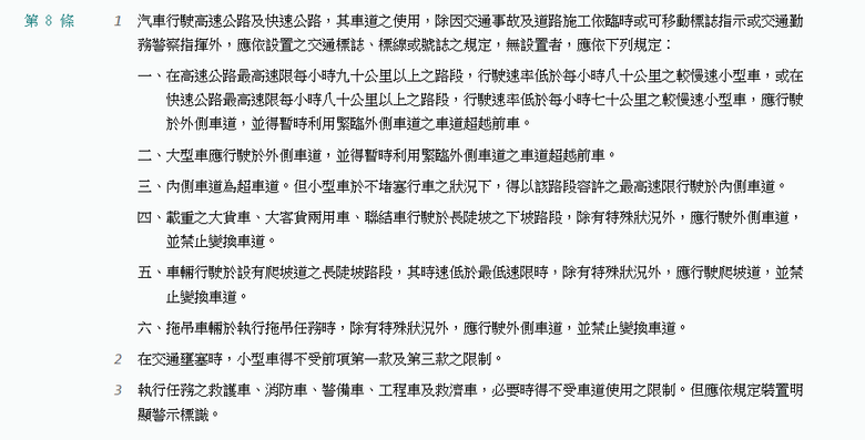 我這個不懂法的人類是這樣解讀的,首先我們高速公路都是90以上,所以我們是符合這條〝在高速公路最高速限每小時九十公里以上之路段〞,再來因為法規說〝行駛速率低於每小時八十公里之較慢速小型車,應行駛於外側車道,並得暫時利用緊臨外側車道之車道超越前車。〞所以開100-110 GPS的我就直接去中線了。
