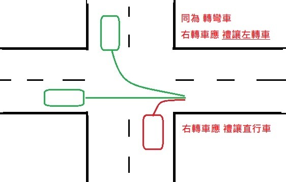 advantage wrote:右轉車要禮讓左轉車 八、對向行駛之左、右轉車輛已轉彎須進入同一車道時,右轉彎車輛應讓左轉彎車輛先行理由:讓左轉車盡早離開路中心,避免阻礙後方車動線(尤其是 無號誌路口,停在"路中"會阻礙橫向動線)你可以主張 "右轉不必禮讓左轉"一旦發生碰撞,你再去揮誰對誰錯.......與我無關!!!