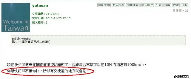 yutasan wrote:...用時速 60km 上高速公路...(恕刪) 的確不是每輛車0-100km/h都能10秒完成,然而以60、70km/h匯入國道,確實是遠比80、90km/h要來得有風險;縱使後方沒車...若在深夜的路上遇見沒開車燈的深色車,那可就真是阿彌陀佛了雖然,塞車時大家一起50km/h匯入國道的鳥事也常發生哎...若大家都更有禮讓心態,相信交通亂象一定會有所改善幾年經驗下來,只要行經交流道,一定遠離外側車道,何必去跟加速道的車搶快呢?若要匯入國道,抓好機會全油門順便清清積碳,以免變速箱龜久了變笨!要下閘道或進休息站...兩三公里前早就龜到外側去了。畢竟,行車安全往往就在一個念頭、一瞬間;孩子老婆等著我回家呢!祝大家行車平安。ps.前陣子有幸跟一位大客車的司機大哥跑了一趟國道,大哥跟我分享很多駕馭大車的邏輯判斷、反應、經驗及技術,真不是小弟這種小客車駕駛所能理解與設想的,因為見識到,所以行經國道時真的是多體諒啊!平安就是福。