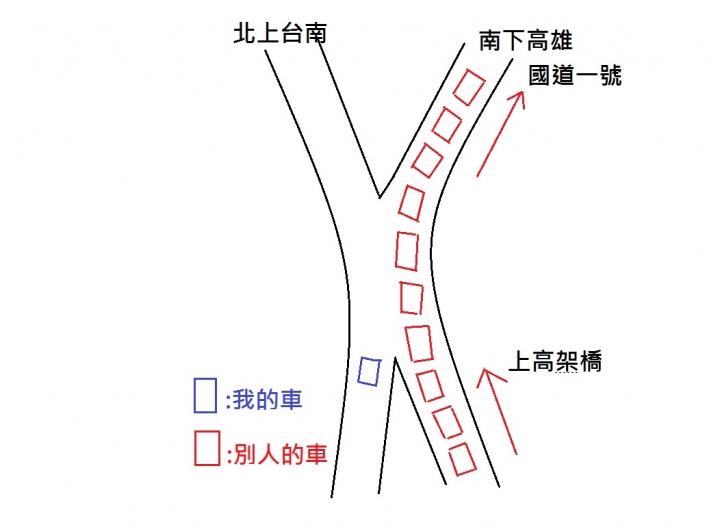 說到插隊,有時候並不是你想的那樣,我就有一個親身體驗,我有一次在北高雄,要回家的路上,就碰到上圖的情形,右側的車子從高架橋下面一路塞到橋上,我原來就在左側高架橋上,如果我要回前鎮的家,我還非得插隊不可,可當我要插隊時,就被別人掹按喇叭。