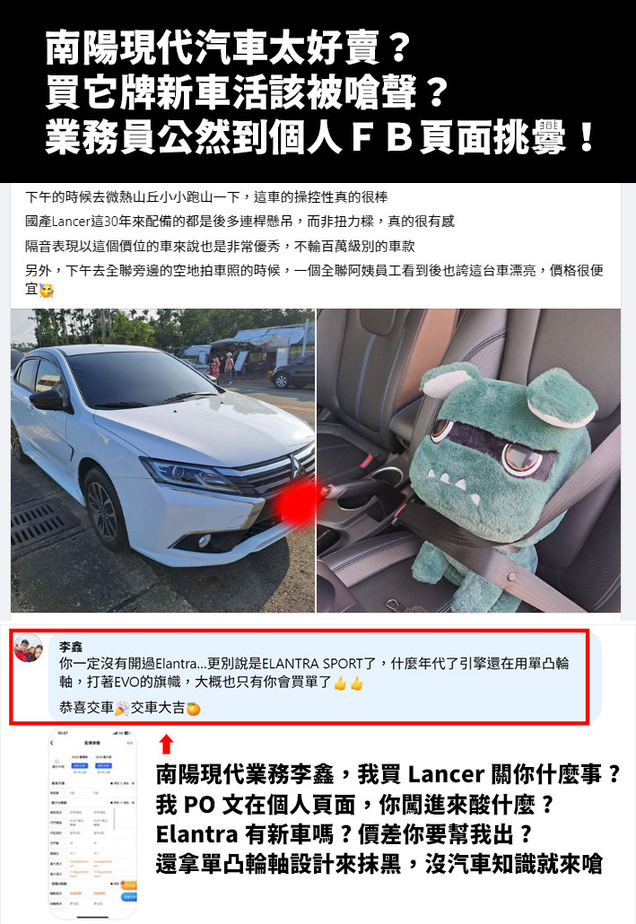 才不告訴你 wrote:我遇過合泰的業務也是...(恕刪) 我也被業務嗆過, 同一廠牌同型號, 簡單說....A 車商看車報價, B車商更優惠, 而C車商優惠又更多,沒理由不選C?A 車商的業務可是直接電話開嗆的.....