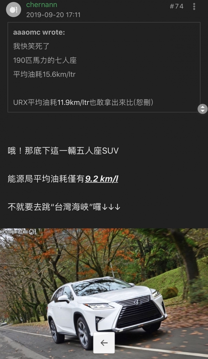 chernann wrote:哦!那底下這一輛五人座SUV能源局平均油耗僅有9.2 km/l.(恕刪) 被人家打臉油耗了所以趕快再找一台油耗更爛的但URX是要跟RX350比什麼馬力?沒關係,大家都習慣這種套路了講不贏就亂扯才是標準的SOP樓主好像也還沒回我